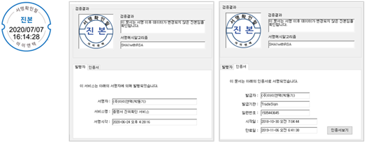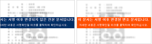 뷰어 실행 즉시 증명서의 위·변조 여부 확인 가능 진본(좌), 위·변조(우)